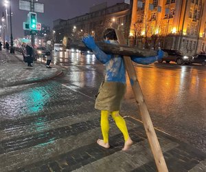 ეკატერინბურგის ქუჩებში უკრაინის ფერებში შეღებილი ჯვარმოკიდებული კაცი გამოჩნდა