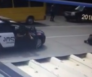 ხაშურში პოლიციის მანქანა გზაზე გადამსვლელს დაეჯახა