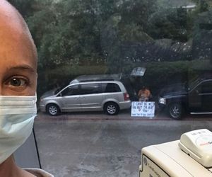 პანდემიის გამო ქიმიოთერაპიაზე მარტო წასული ცოლი ქმარმა ეზოდან ბანერით გაამხნევა