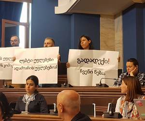 LIVE: გადადგეს სოფო კილაძე - ლგბტ აქტივისტებმა კომიტეტის სხდომაზე პლაკატები გაშალეს