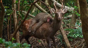 იშვიათი ფოტო: ირემზე "ამხედრებული" მაიმუნი