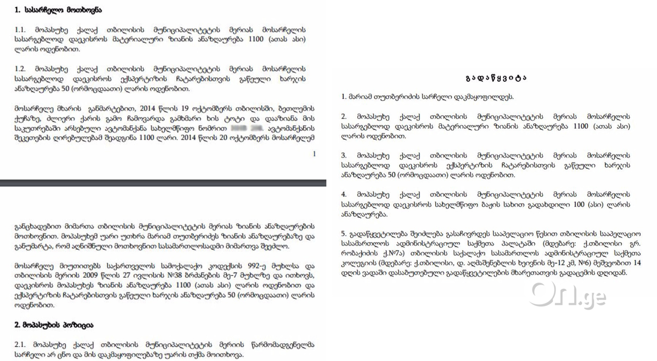 მოსარჩელე განმარტავდა, რომ 2014 წელს, ძლიერი ქარის გამო, ჩამოვარდა გამხმარი ხის ტოტი და დააზიანა მის საკუთრებაში არსებული ავტომანქანა. ამავე წელს, თუთბერიძემ მერიას მიმართა და ზარალის ანაზღაურება სთხოვა, რაზეც უარი მიიღო.