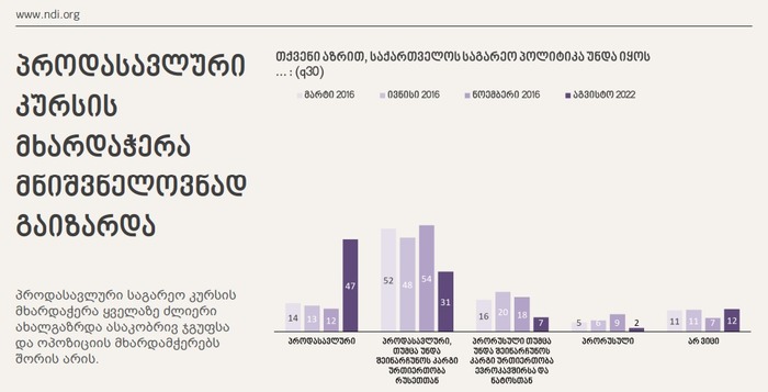 დეტალები: კვლევის მიხედვით, პროდასავლური კურსის მხარდაჭერა მნიშვნელოვნად გაიზარდა.