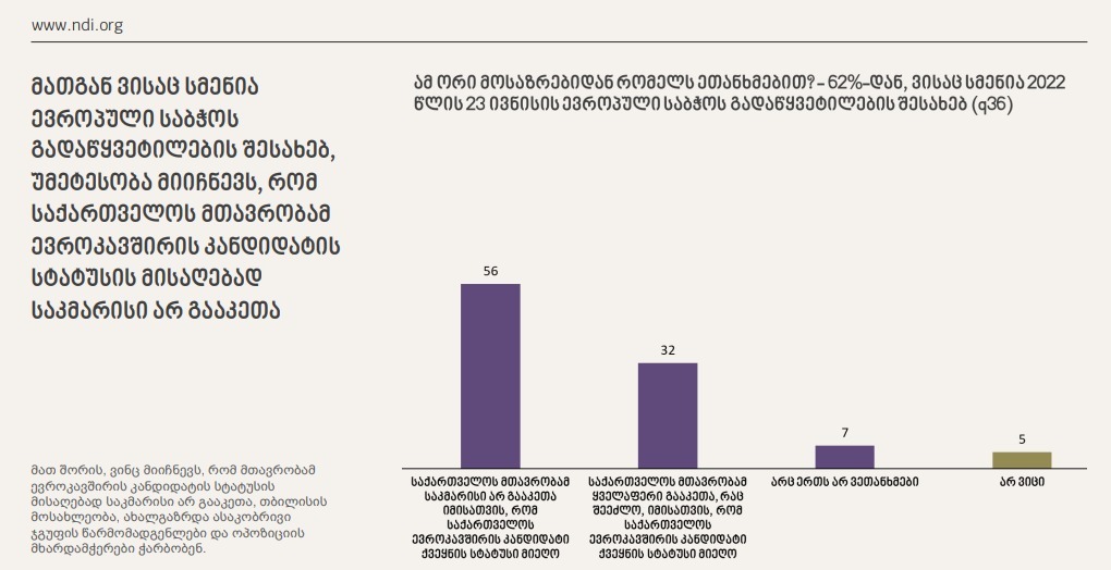 - NDI კვლევის მიხედვით, მათგან ვისაც ამ გადაწყვეტილების შესახებ სმენია, 56% თვლის, რომ მთავრობამ საკმარისი არ გააკეთა იმისთვის, რომ საქართველოს ევროკავშირის კანდიდატი ქვეყნის სტატუსი მიეღო.