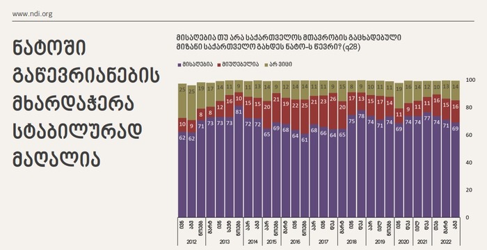 NATO: NDI-ის კვლევის მიხედვით, ალიანსში გაწევრიანების მხარდაჭერა სტაბილურად მაღალია.