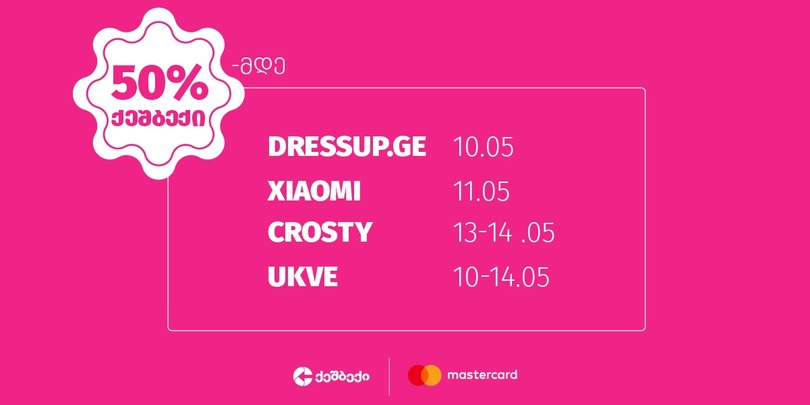 - 10-დან 14 მაისამდე — უკვე .UKVE (ელექტრონული და ფიზიკური ობიექტი) – 40% CashBack | ლიმიტი - 200 ლარი