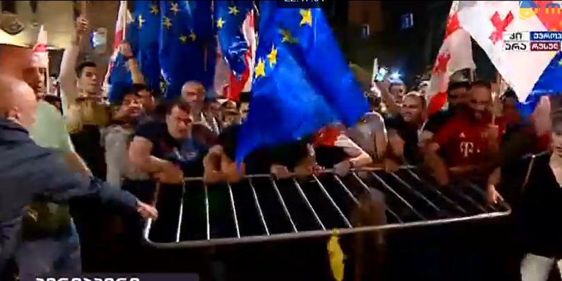 პარლამენტთან ვითარება დაიძაბა — აქციის მონაწილეები ცდილობენ, საქართველოსა და ევროკავშირის დროშებით სცენაზე ავიდნენ