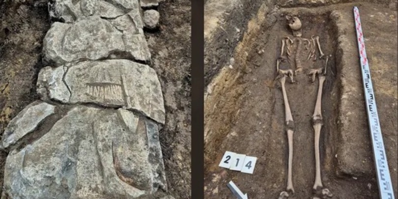 ფილის აღმოჩენიდან მალევე ArcheoScan-ის გუნდმა ქვა ამოიღო და ადგილი უფრო ღრმად გათხარა. მათ კარგად შემონახული კაცის ჩონჩხი აღმოაჩინეს, მაგრამ სამარხში ნეშტთან ერთად სხვა ნივთები არ ყოფილა.