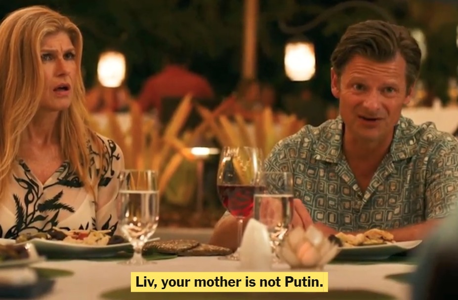 სერიალში, ოლივია — რომელიც მდიდარ ოჯახთან ერთად დასასვენებლადაა — სასადილო მაგიდასთან ვლადიმერ პუტინს ახსენებს. ძალაუფლების მორალურ ფასზე მისმა ირონიული შენიშვნამ კრემლი უკმაყოფილო დატოვა და 8 წამი, ფაქტობრივად, გააქრო.