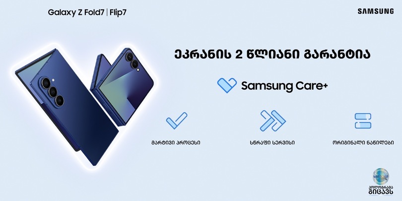 ახალი Galaxy Z Fold7 და Galaxy Z Flip7 უკვე საქართველოშია და ხელმისაწვდომია Samsung-ის ოფიციალური პარტნიორი მაღაზიების ქსელში. 25 აგვისტოდან 21 სექტემბრის ჩათვლით მათი შეძენისას მიიღებ განსაკუთრებულ საჩუქარს — Samsung Care+-ს — ეკრანის 2-წლიან გარანტიას, რაც გულისხმობს ეკრანის შეცვლას ნებისმიერი დაზიანების შემთხვევაში, მხოლოდ მომსახურების საფასურის გადახდით. ისარგებლე სერვისით სწრაფად და დარწმუნებული იყავი, რომ გამოიყენება მხოლოდ ორიგინალი და ოფიციალური ნაწილები.