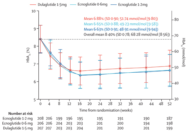ეკნოგლუტიდის დოზები სისხლში შაქრის შემცირების თვალსაზრისით ისეთივე ეფექტიანი იყო, როგორც დულაგლუტიდი.