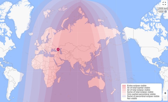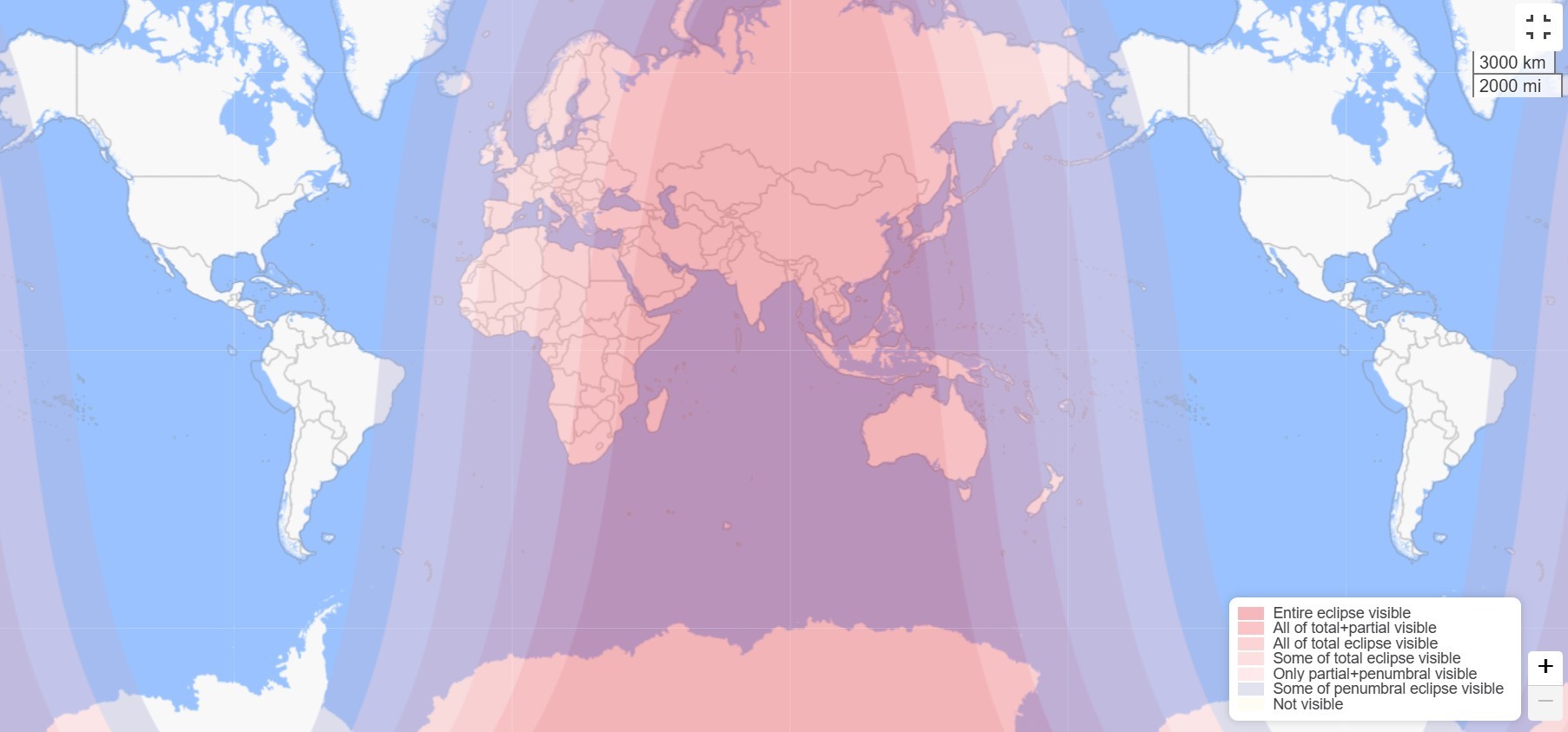 პლანეტარული განლაგების დამსახურებით, ამ მოვლენაზე დაკვირვებას 7 მილიარდამდე ადამიანი შეძლებს. შესაძლოა, სხვადასხვა ადგილას ამინდი ხელის შემშლელი იყოს, მაგრამ მსოფლიო პოპულაციის დაახლოებით 60% სრულ დაბნელებას მაინც იხილავს, ხოლო 87% — ნაწილობრივს.