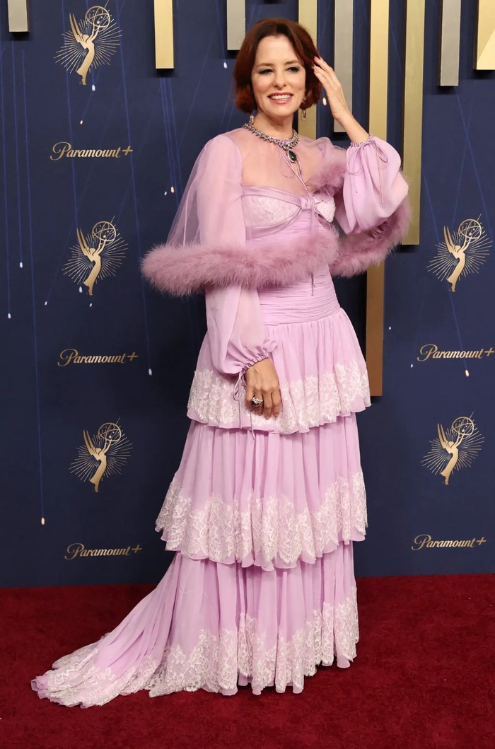 Emmy-ზე ბევრი წითელი კაბა ჩანდა, მაგრამ ამ სამი მსახიობის სამოსი განსაკუთრებულად გამოირჩეოდა თავისებური დეკოლტეებით: სიდნი სვინის Oscar de la Renta-ს კაბას გულის ფორმის დეკოლტე ამშვენებდა; Only Murders in the Building-ის ვარსკვლავ სელენა გომესს Louis Vuitton-ის მაღალყელიანი კაბა ეცვა; ხოლო The Penguin-ის მსახიობ კრისტინ მილიოტის Danielle Frankel-ის კვადრატული დეკოლტე უხდებოდა.