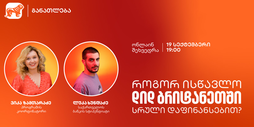 19 სექტემბერს, 19:00 საათზე, დაესწარი საქართველოს ბანკის მიერ გამართულ ვებინარს და გაიგე, როგორ მიიღო დიდ ბრიტანეთში, სამაგისტრო საფეხურზე სწავლის სრული დაფინანსება.
