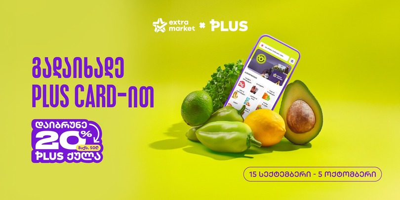 22 სექტემბრიდან 12 ოქტომბრის ჩათვლით, განსაკუთრებული შეთავაზებით ისარგებლებ: PLUS Card-ით გადახდისას 20% PLUS ქულას (მაქსიმუმ 50 ლარი) დაიბრუნებ.