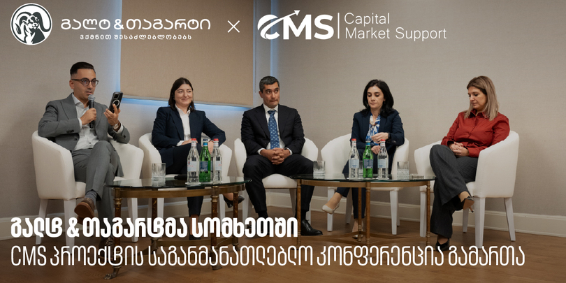 გალტ & თაგარტმა, 23 სექტემბერს სომხეთში "კაპიტალის ბაზრის მხარდაჭერის პროგრამის (CMS)“ ფარგლებში, საგანმანათლებლო კონფერენცია გამართა. კონფერენცია ევროპის რეკონსტრუქციისა და განვითარების ბანკისა (EBRD) და ევროკავშირის მხარდაჭერითა და Ameria Management Advisory-თან თანამშრომლობით ჩატარდა. შეხვედრა კაპიტალის ბაზრის განვითარებისთვის საჭირო ESG ინსტრუმენტების განხილვას დაეთმო.