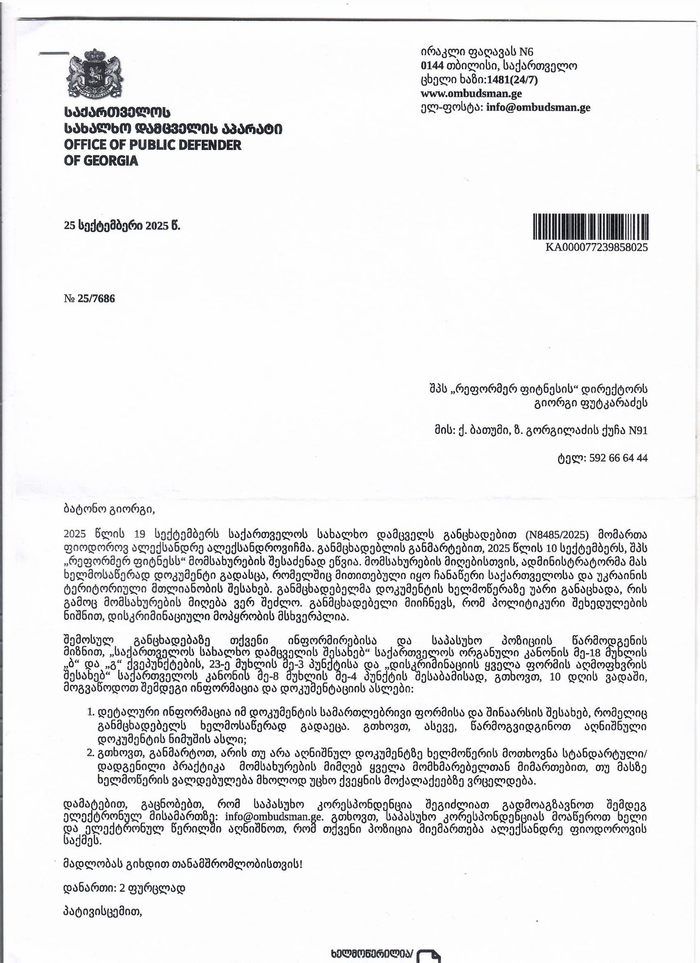 "მომსახურების მიღებისთვის, ადმინისტრატორმა მას ხელმოსაწერად დოკუმენტი გადასცა, რომელშიც მითითებული იყო ჩანაწერი საქართველოსა და უკრაინის ტერიტორიული მთლიანობის შესახებ. განმცხადებელმა დოკუმენტის ხელმოწერაზე უარი განაცხადა, რის გამოც მომსახურების მიღება ვერ შეძლო. იგი მიიჩნევს, რომ პოლიტიკური შეხედულების ნიშნით, დისკრიმინაციული მოპყრობის მსხვერპლია," – წერს სახალხო დამცველი.
