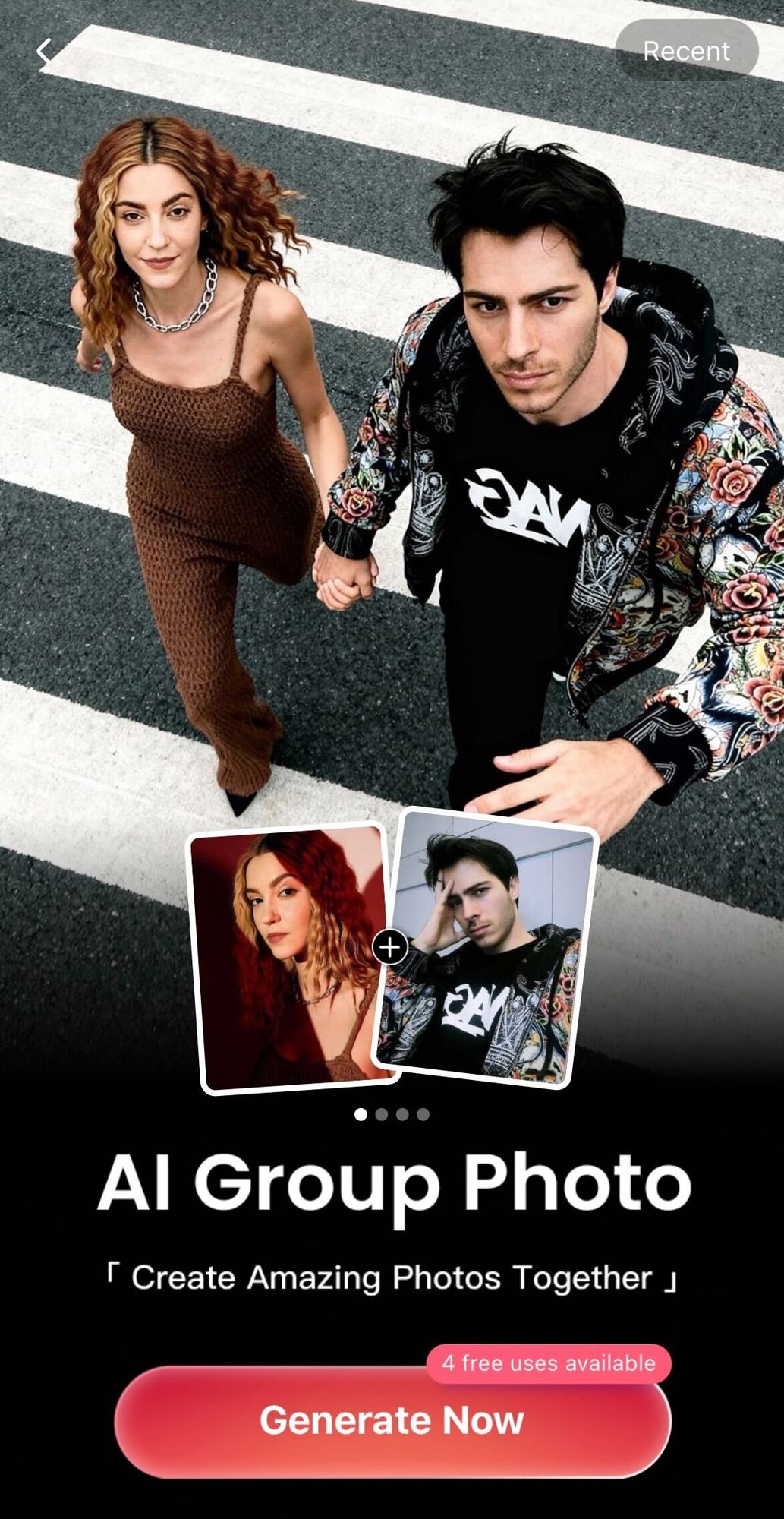 Genrate Now ღილაკზე დაჭერის შემდეგ ორი ფოტო უნდა აარჩიოთ იმ ადამიანებისა, რომლებიც ფოტოზე გინდათ იყვნენ. კარგი შედეგისთვის სასურველია, მიწოდებული გამოსახულებები მკაფიო იყოს. შექმნილი სურათის სანახავად Recent ღილაკს უნდა დააჭიროთ, რომელიც ეკრანის მარჯვენა ზედა კუთხეშია გამოსახული.