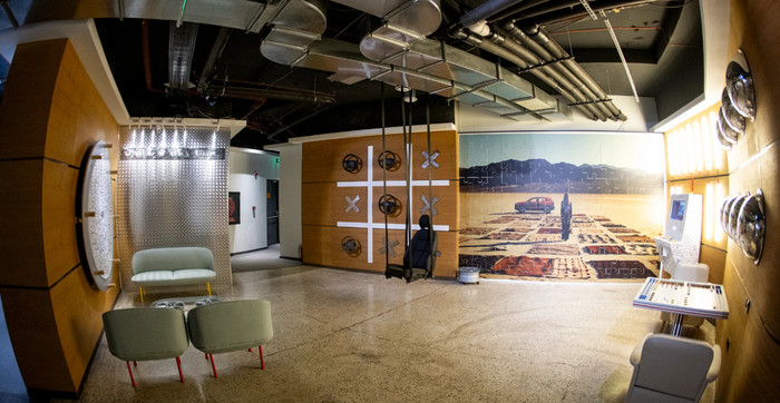 ლაუნჯში განთავსებულია ინტერაქტიური ინსტალაციები, თამაშები და ის დიზაინერული ელემენტები, რომლებიც კომფორტთან ერთად შემოქმედებით ენერგიასა და ისეთივე უსაფრთხო და მყუდრო გარემოს ქმნის, როგორიც თავად ვოლვოს ფილოსოფიაა.