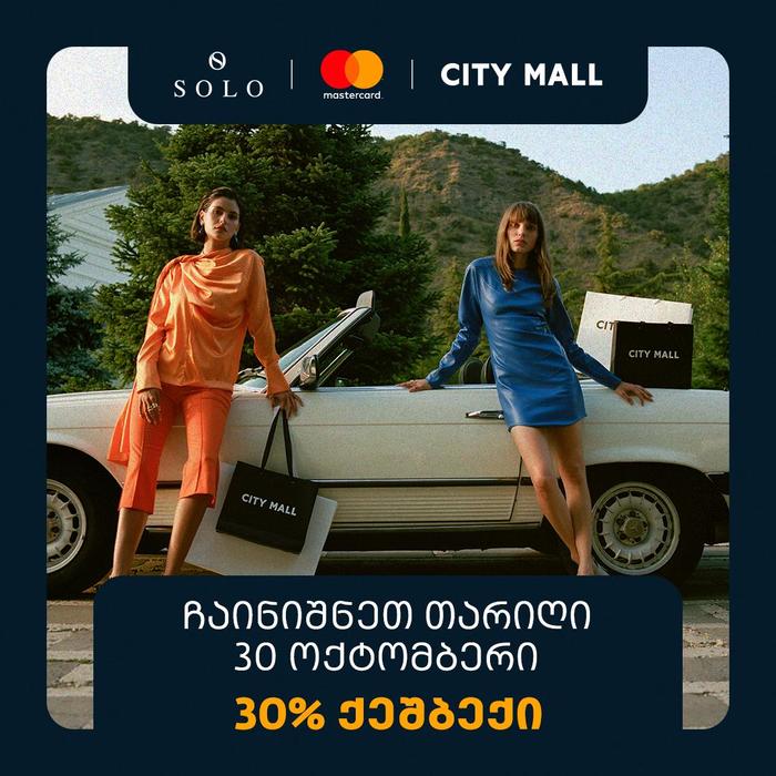 ექსკლუზიურად, 30 ოქტომბერს შესაძლებლობა გექნებათ, ეწვიოთ სავაჭრო ცენტრს 10:00-დან 00:00 -მდე, გადაიხადოთ SOLO Mastercard World Elite ბარათით სითი მოლის 100-ზე მეტ მაღაზიაში და დაიბრუნოთ გადახდილი თანხის 30%, ულიმიტოდ. კამპანიის შესახებ დეტალური ინფორმაცია განთავსდება სითი მოლის გვერდზე.