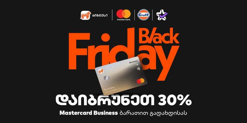 Mastercard Business Card-ის მფლობელებს შესაძლებლობა აქვთ, 28 ნოემბერს, Black Friday-ზე, Gulf-ის ქსელში საწვავის შეძენისას 30%-იანი ქეშბექი (მაქსიმუმ 100 ლარის ოდენობით) მიიღონ.