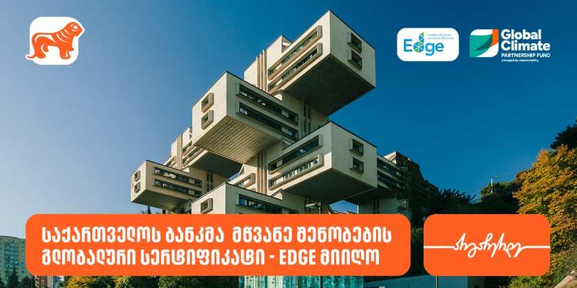 საქართველოს ბანკი, ქვეყნის წამყვანი ფინანსური ინსტიტუტი, გარემოსდაცვითი სტანდარტების დანერგვას აგრძელებს. ბანკის სათავო ოფისმა, რომელიც ქართული არქიტექტურის უნიკალური ძეგლია, მწვანე შენობის EDGE (Excellence in Design for Greater Efficiencies) პრესტიჟული საერთაშორისო სერტიფიკატი მოიპოვა. პროექტი ბანკის ერთ-ერთი მნიშვნელოვანი პარტნიორი საერთაშორისო ფინანსური ინსტიტუტის — გლობალური კლიმატის პარტნიორობის ფონდის (GCPF) ფინანსური მხარდაჭერით განხორციელდა.