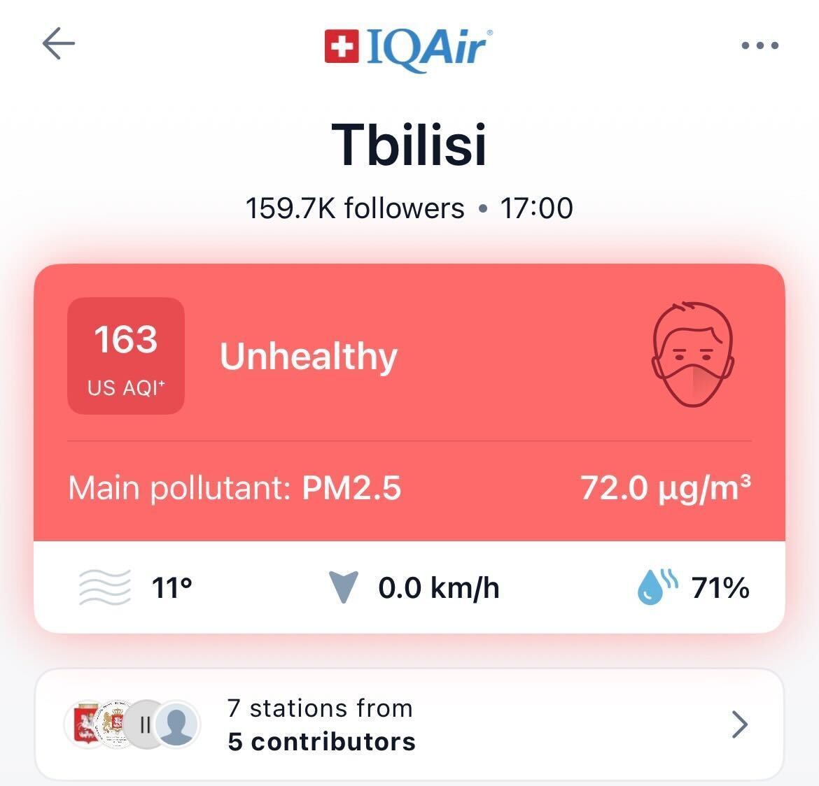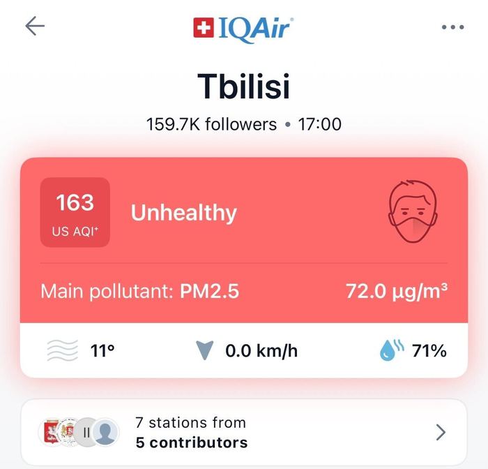 გარდა ამ პორტალისა, არსებობს სპეციალური აპლიკაციებიც, მათ შორის IQAir. ჰაერის ხარისხის აპარატები კერძო პირებსაც აქვთ განთავსებული სხვადასხვა ლოკაციაზე, ამ აპლიკაციიდან კი მათი მიღებული შედეგების ნახვასაც შეძლებთ. მაგალითისთვის, 1-ელ დეკემბერს 17 საათის მონაცემებით ჰაერის ხარისხი ასეთი იყო: