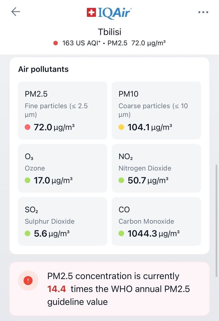 ქვემოთ აპლიკაცია სხვა დამაბინძურებელი ნივთიერებების კონცენტრაციებსაც გაჩვენებთ. წერია ისიც, თუ რამდენად შეესაბამება ჰაერის ხარისხი WHO-ს რეკომენდაციებს. ამ შემთხვევაში, როგორც ხედავთ, კონკრეტულად PM2.5-ის კონცენტრაცია 14.4-ჯერ აღემატება WHO-ს მიერ რეკომენდებულ დაშვებულ მაჩვენებელს.