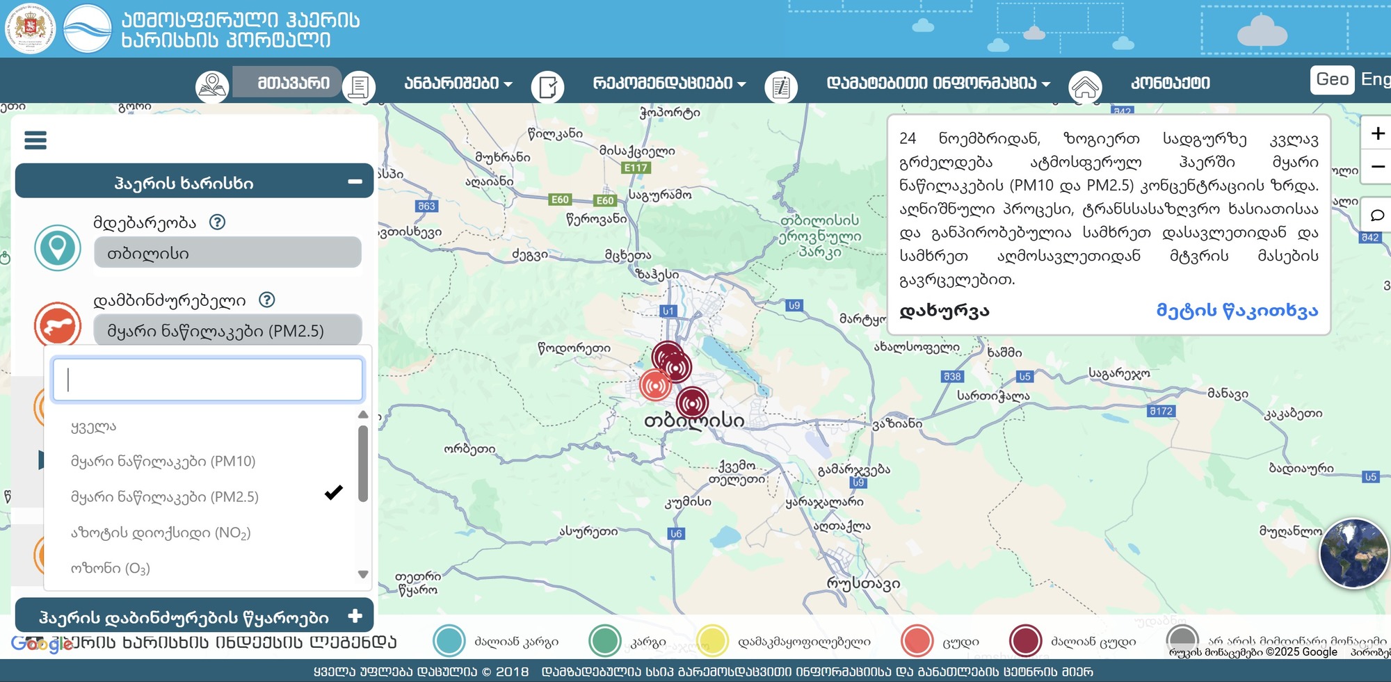 ჰაერში ამჟამად მყარი ნაწილაკების — PM2.5-ისა და PM10-ის — რაოდენობა დასაშვებ მაჩვენებელზე ბევრად მაღალია. ეს 6 ნოემბრიდან, თითქმის ერთი თვეა, ასეა. პრობლემა ისაა, რომ აღნიშნული ნაწილაკები ჩვენს სასუნთქ სისტემაში, ფილტვებსა და პოტენციურად სისხლშიც კი აღწევს; ამან შეიძლება უსიამოვნო სიმპტომები გამოიწვიოს, ხანგრძლივ პერსპექტივაში კი ჯანმრთელობის პრობლემების, მათ შორის სიმსივნის, რისკიც გაზარდოს. სხვათა შორის, დადგენილია, რომ დაბინძურებული ჰაერი ყოველწლიურად მილიონობით ადამიანის სიკვდილს იწვევს.