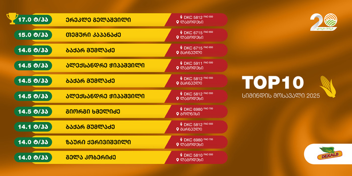 წელს, ისევე როგორც გასულ წლებში აგროსფეროს პარტნიორმა ფერმერებმა Dekalb-ის სიმინდის ჰიბრიდების დახმარებით არნახული მოსავალი აიღეს. მეტიც, ზოგიერთმა ფერმერმა წინა წლის მონაცემების გაუმჯობესებაც კი შეძლო. სიმინდის მოსავლის 2025 წლის რეიტინგი ამგვარია: