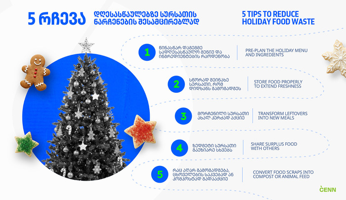 სადღესასწაულო სუფრას ყველა ქვეყანაში განსაკუთრებული ყურადღება ექცევა, მაგრამ, საქართველოში, რომლის სავიზიტო ბარათი გასტრონომიული კულტურაცაა, ახალი წლისთვის გაწყობილი მაგიდა კერძების სიუხვით გამოირჩევა. არადა, ნარჩენების მართვის თვალსაზრისით, ერთ-ერთი მთავარი გამოწვევა სწორედ ჭარბ საკვებს უკავშირდება: მსოფლიოში ყოველწლიურად მილიონობით ტონა ვარგისი საკვები იყრება ზამთრის დღესასწაულებზე. ეს ორგანული ნარჩენი ხშირად არც გადამუშავდება და არც კომპოსტირდება — პირდაპირ ნაგავსაყრელზე ხვდება, რაც მეთანის ემისიების ზრდას იწვევს.