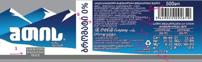 მოდით, ეს ყველაფერი ახლა "მთის" მინერალური წყლის ეტიკეტზე ვნახოთ, სადაც ზემოთ ჩამოთვლილი დეტალები შესაბამისი ციფრებითაა მონიშნული.