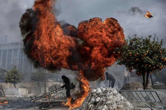 აქციის მონაწილეები პოლიციას უპირისპირდებიან საბერძნეთის პარლამენტის წინ, ქვეყნის ისტორიაში ყველაზე მძიმე სარკინიგზო კატასტროფის მეორე წლისთავთან დაკავშირებული პროტესტის დროს, მაშინ როდესაც გამოძიება კვლავ გრძელდება — ათენი, საბერძნეთი, 2025 წლის 28 თებერვალი.