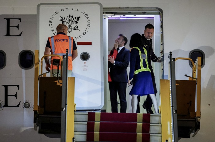 ბრიჯიტ მაკრონის ხელი საფრანგეთის პრეზიდენტის, ემანუელ მაკრონის სახეზე, როცა წყვილი სამხრეთ-აღმოსავლეთ აზიის ტურნეს დასაწყებად ვიეტნამში ჩავიდა — ნოი ბაის საერთაშორისო აეროპორტში, ჰანოი, ვიეტნამი, 2025 წლის 25 მაისი.
