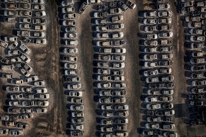 დრონიდან გადაღებულ კადრში ჩანს ტყის ხანძრის შედეგად დამწვარი ავტომობილები დიმიში, პატრასის მახლობლად — საბერძნეთი, 2025 წლის 14 აგვისტო.