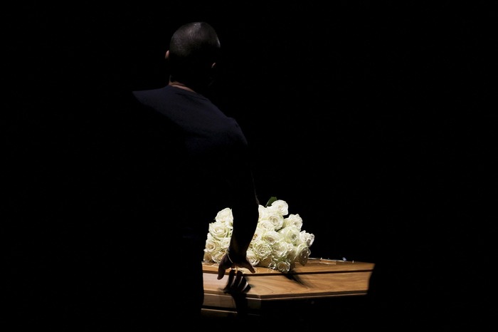 ადამიანი ეხება დიზაინერ ჯორჯო არმანის კუბოს, როდესაც ის დასვენებულია Armani/Teatro-ში, 91 წლის ასაკში გარდაცვალების შემდეგ — მილანი, იტალია, 2025 წლის 6 სექტემბერი.