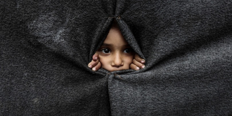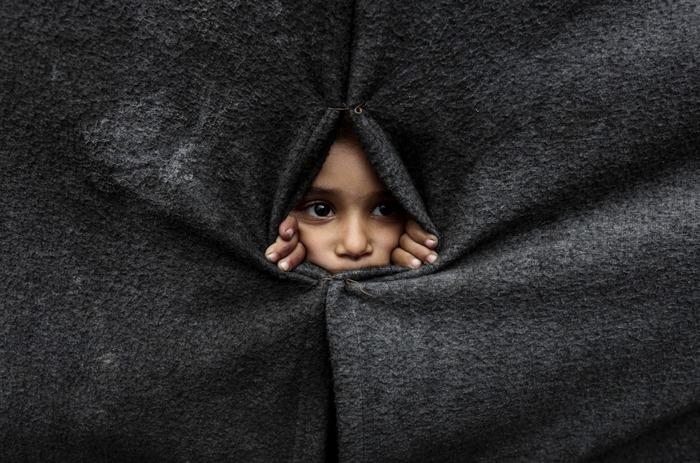 დევნილი პალესტინელი ბავშვი საბნებისგან გაკეთებული ფარდიდან იჭყიტება — მას შემდეგ, რაც აშშ-ის პრეზიდენტმა დონალდ ტრამპმა განაცხადა, რომ ისრაელი და ჰამასი ღაზაში ცეცხლის შეწყვეტის პირველ ეტაპზე შეთანხმდნენ — ხან იუნისი, ღაზის სექტორის სამხრეთი ნაწილი, 2025 წლის 9 ოქტომბერი.