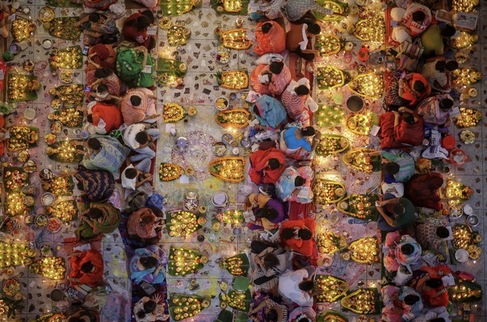 ინდუისტი მლოცველები ერთად სხედან ზეთის სანათებთან და ლოცულობენ ინდუისტ წმინდანისა და ფილოსოფოსის, ლოკენათ ბრაჰმაჩარის მიმართ, დაკაში, ბანგლადეშში მდებარე ტაძარში Rakher Upobash-ის ფესტივალზე, 2025 წლის 4 ნოემბერი.