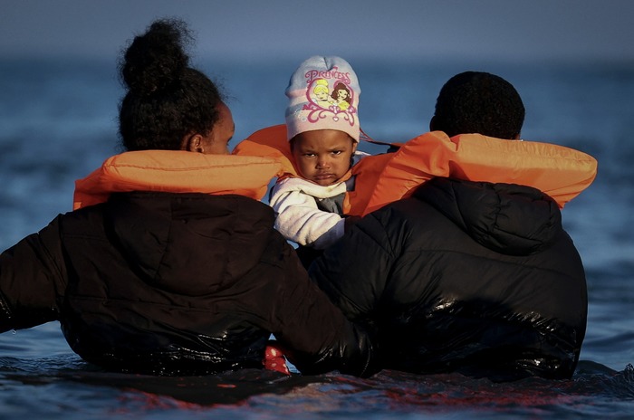მიგრანტები ზღვაში შედიან, რათა შეეცადონ ჩასხდომას გასაბერ ნავზე, რომელიც ჩრდილოეთ საფრანგეთის სანაპიროდან ინგლისის არხის გადაკვეთით ბრიტანეთისკენ მიემართება — პეტი-ფორ-ფილიპის სანაპიროდან, გრაველინი, კალესთან ახლოს, საფრანგეთი, 2025 წლის 27 სექტემბერი.
