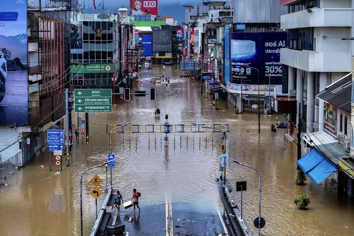 ძლიერმა მუსონურმა წვიმებმა სამხრეთ ტაილანდში მასშტაბური წყალდიდობა გამოიწვია, რის შედეგადაც საცხოვრებელი სახლები დაიტბორა და ადამიანები ჩაძირულ ქუჩებში გადაადგილდებიან, 2025 წლის 23–28 ნოემბერი.