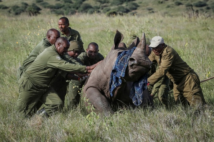 რეინჯერები დასამუშავებლად ამზადებენ დამამშვიდებელი საშუალებით ნარკოზში მყოფ 3 წლის თეთრ მამრ მარტორქას, სახელად კვინტუსს — ლევას ველური ბუნების ნაკრძალში, კენიის მთის ჩრდილოეთით, მერუს ოლქში, კენია, 2025 წლის 13 მაისი.