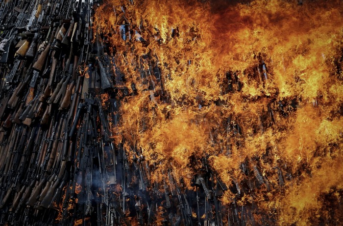 დაახლოებით 7 000 უკანონო ცეცხლსასროლი იარაღისა და მცირე ზომის შეიარაღების ნაირსახეობა, რომლებიც სხვადასხვა უსაფრთხოების ოპერაციების დროს იქნა ამოღებული, იწვის მცირე იარაღის რეგიონული ცენტრის 20 წლის იუბილესადმი მიძღვნილი ღონისძიების ფარგლებში — ეროვნული პოლიციის ლიდერობის აკადემიაში, ნგონგის რაიონის ბულბულის უბანში, ნაირობთან ახლოს, კენია, 2025 წლის 13 ივნისი.