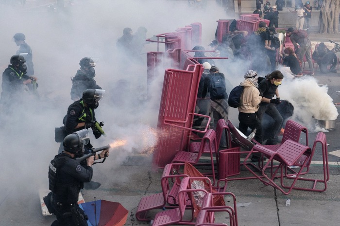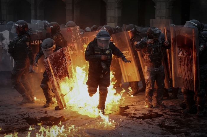 პოლიციის თანამშრომლები ცეცხლის ალს გაურბიან, მაშინ როცა დემონსტრანტები პოლიციას უპირისპირდებიან — 1968 წლის ტლატელოლკოს მოედნის ხოცვა-ჟლეტის 57-ე წლისთავის აღსანიშნი მსვლელობის დროს, როდესაც სტუდენტები სამხედროებმა დახვრიტეს — მეხიკო, მექსიკა, 2025 წლის 2 ოქტომბერი.