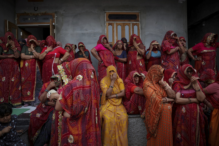 ქალები იკრიბებიან ინდოეთის საჰაერო ძალების წევრის დაკრძალვაზე, რომელიც უდჰამპურზე განხორციელებულ თავდასხმას ემსხვერპლა — 2025 წლის 10 მაისი.