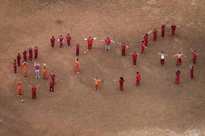 დრონიდან გადაღებულ კადრში ჩანს ვენესუელი მიგრანტი დაკავებულები, რომლებიც ბანდის წევრობაში დადანაშაულების ფონზე ელ სალვადორის ცნობილ ციხეში დეპორტაციის შიშს გამოთქვამენ და საკუთარი სხეულებით SOS-ის სიგნალს ქმნიან — Bluebonnet-ის დაკავების ცენტრის ეზოში, ენსონი, ტეხასი, აშშ, 2025 წლის 28 აპრილი.