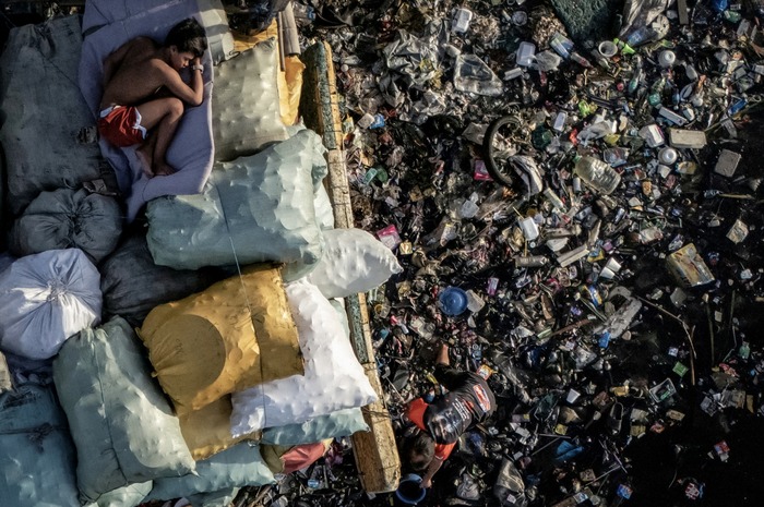 დრონიდან გადაღებულ კადრში ჩანს ბიჭი, რომელსაც დაბინძურებული პასიგის მდინარის გასწვრივ ნაგვის ტომრებზე სძინავს — გარემოს დაცვის მსოფლიო დღეს, მანილა, ფილიპინები, 2025 წლის 5 ივნისი.