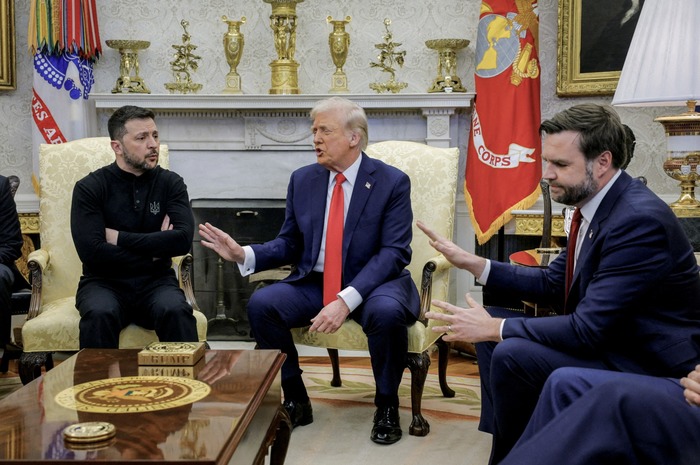 უკრაინის პრეზიდენტი ვოლოდიმირ ზელენსკი ხვდება აშშ-ის პრეზიდენტს დონალდ ტრამპსა და აშშ-ის ვიცე-პრეზიდენტს ჯეი დი ვენსს — თეთრ სახლში, ვაშინგტონი, კოლუმბიის ოლქი, აშშ, 2025 წლის 28 თებერვალი.