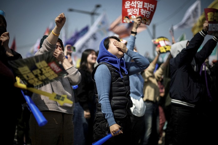 ადამიანები ზეიმობენ პრეზიდენტ იუნ სოკ იოლის იმპიჩმენტს— საკონსტიტუციო სასამართლოსთან ახლოს, სეული, სამხრეთ კორეა, 2025 წლის 4 აპრილი.