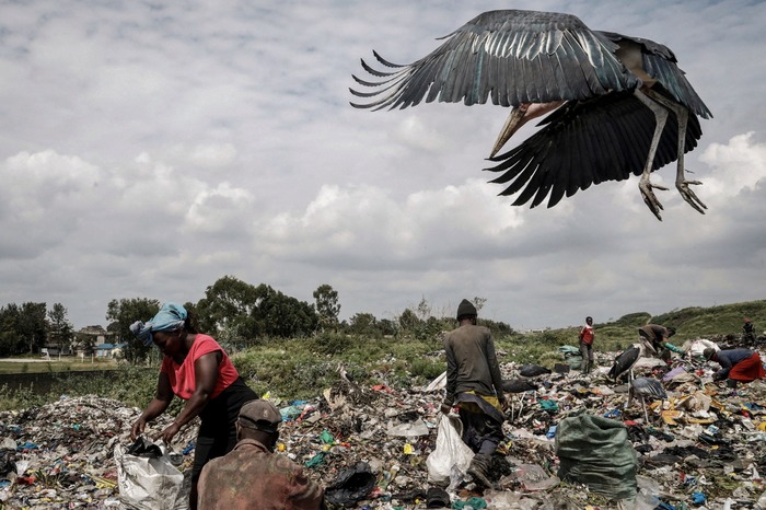 მარაბუს სახეობის წერო დაფრინავს იმ ადამიანების თავზე, რომლებიც გადამუშავებადი პლასტმასის მასალებს ეძებენ დანდორას ნაგავსაყრელზე — ნაირობის გარეუბანში, კენია, 2025 წლის 4 ივნისი.