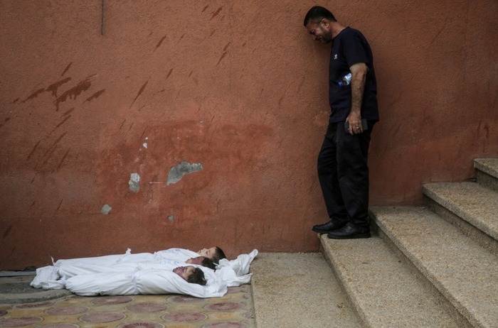 მგლოვიარე ტირის პალესტინელი ძმების — იაჰიას, მუსას და იბრაჰიმ ჯადალაჰების — ცხედრებთან, რომლებიც დედასთან, ასიასთან ერთად, მედიკოსების ცნობით, ღამით ისრაელის დარტყმის შედეგად დაიღუპნენ საკუთარ სახლზე განხორციელებული შეტევისას — ნასერის საავადმყოფოში, ხან იუნისი, ღაზის სექტორის სამხრეთი ნაწილი, 2025 წლის 10 ივლისი.